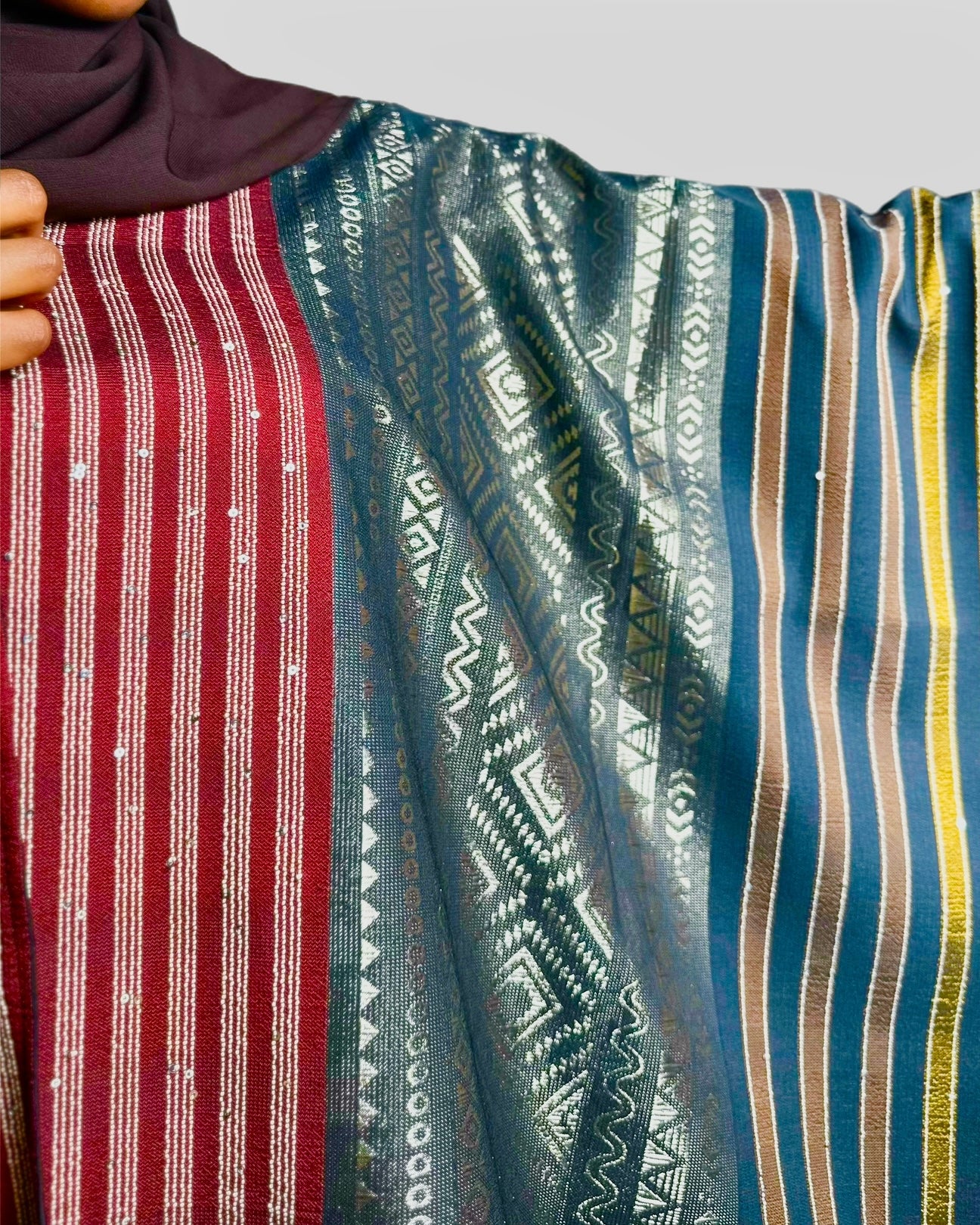 This stunning abaya features a rich, dark base fabric contrasted with vibrant, striped accents. These intricate, colourful patterns add a touch of West African heritage and flair, making this a truly unique statement piece, perfect for an occasion.